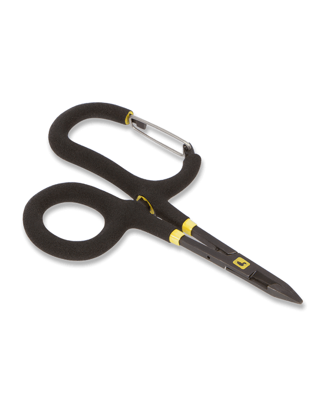 The ultimate hemostat, thoughtfully designed from the tips to the jaws to the handle. A carabiner handle means you can store anywhere and the tight angles and engineered shape accommodate all fly sizes, allow for easy hook removal, and can crimp even the heaviest of barbs. Over sized thumb and finger holes accommodate large or gloved hands, and the compact cutting surface easily clips light or heavy leader.