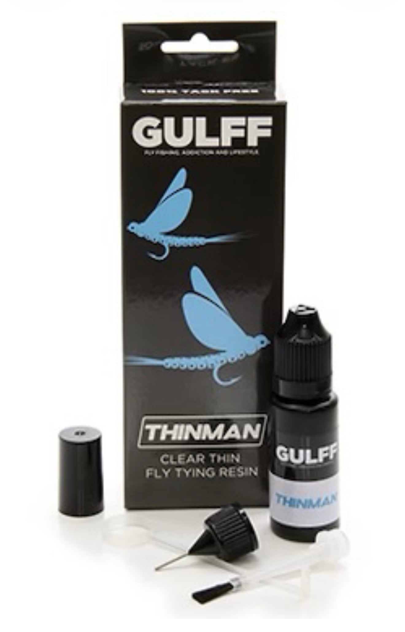 Gulff Thinman (low viscosity) is thin but not too thin viscosity for beautiful finishing. It does not cover or fill the fly detail, but highlights it.
