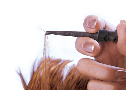This is like an electronic clip, but is made specifically for fly tying. By pressing the bottom of the spring loaded tool, the small hook at the top raises up to capture the hackle.