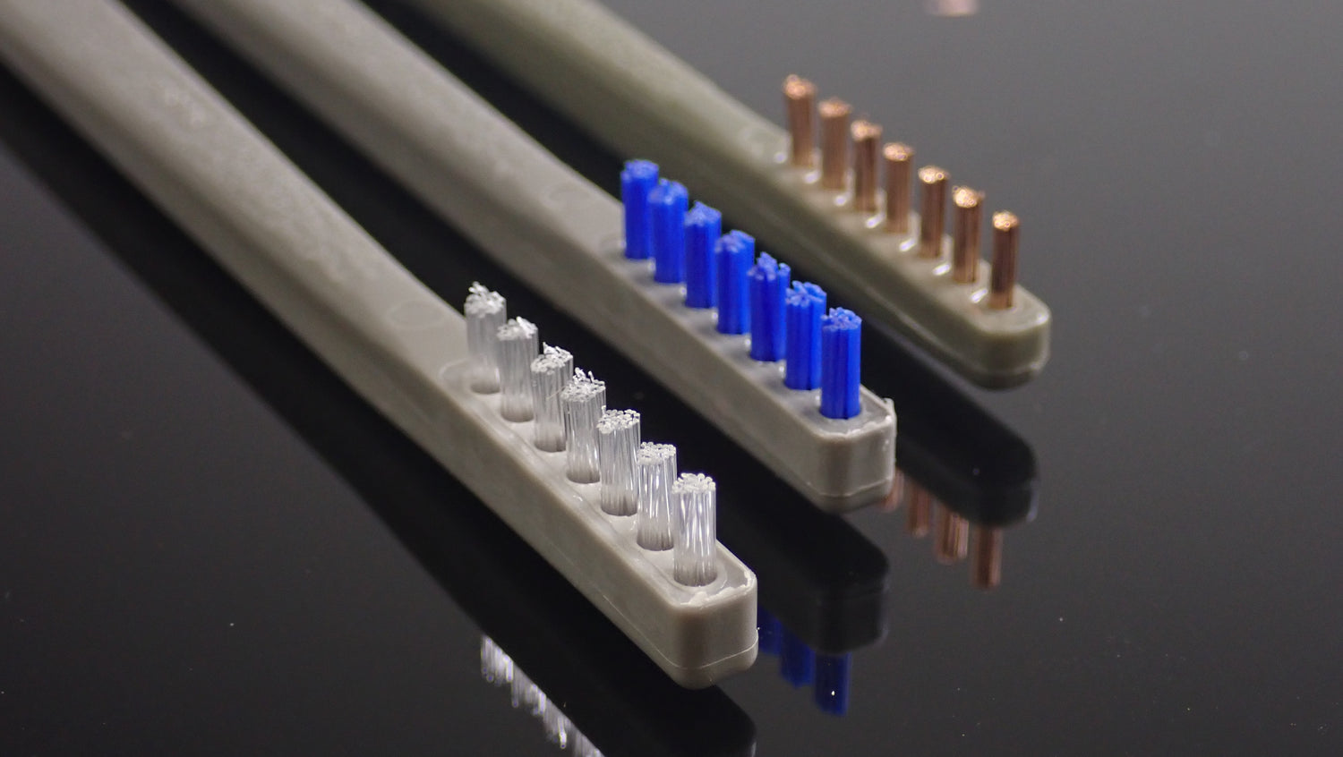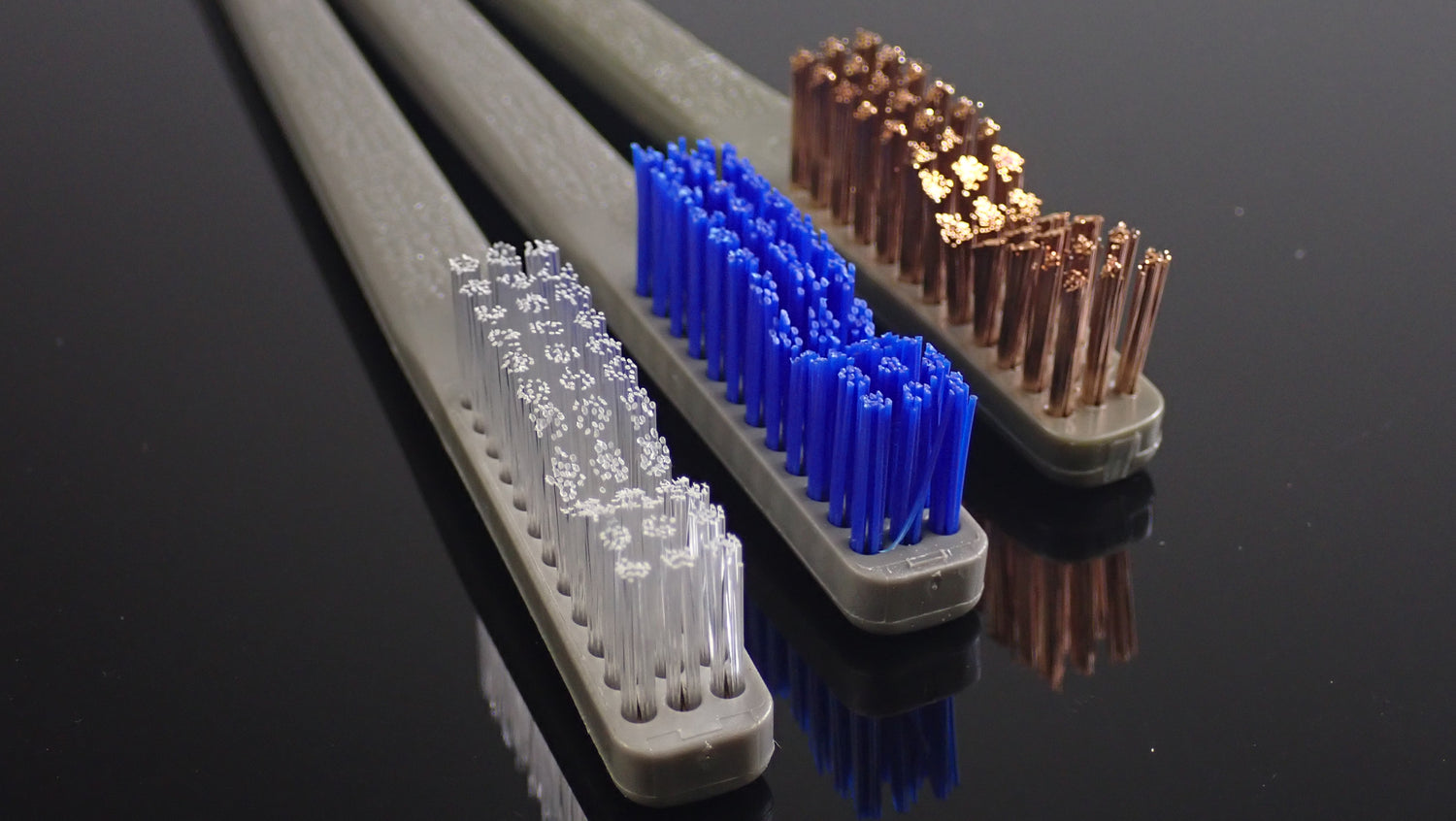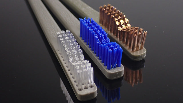 3 brush set for every application. The white soft bristle brush is great for gently brushing out dubbing to give you a buggy, natural look or freeing trapped hackle or marabou fibers.