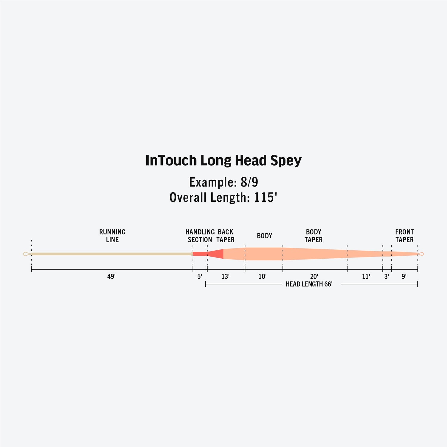 The InTouch Long Head Spey line is designed for big rivers and longer two-handed and Spey rods. A series of sophisticated tapers and steps in the line design makes this one of the easiest casting long belly lines on the market, and a total joy to cast. The rear weight distribution ensures the rod loads easily, while the unique front taper design allows energy to unroll effortlessly to the fly — resulting in easy and effortless distance. The line is built with RIO's ultra-low stretch ConnectCore for the very best in efficiency and load.