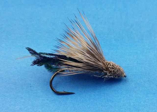 Best of two worlds. This pattern has the profile and broad water-pushing head of a Muddler, and the fish attracting magic of iridescent peacock swords. Size: #8