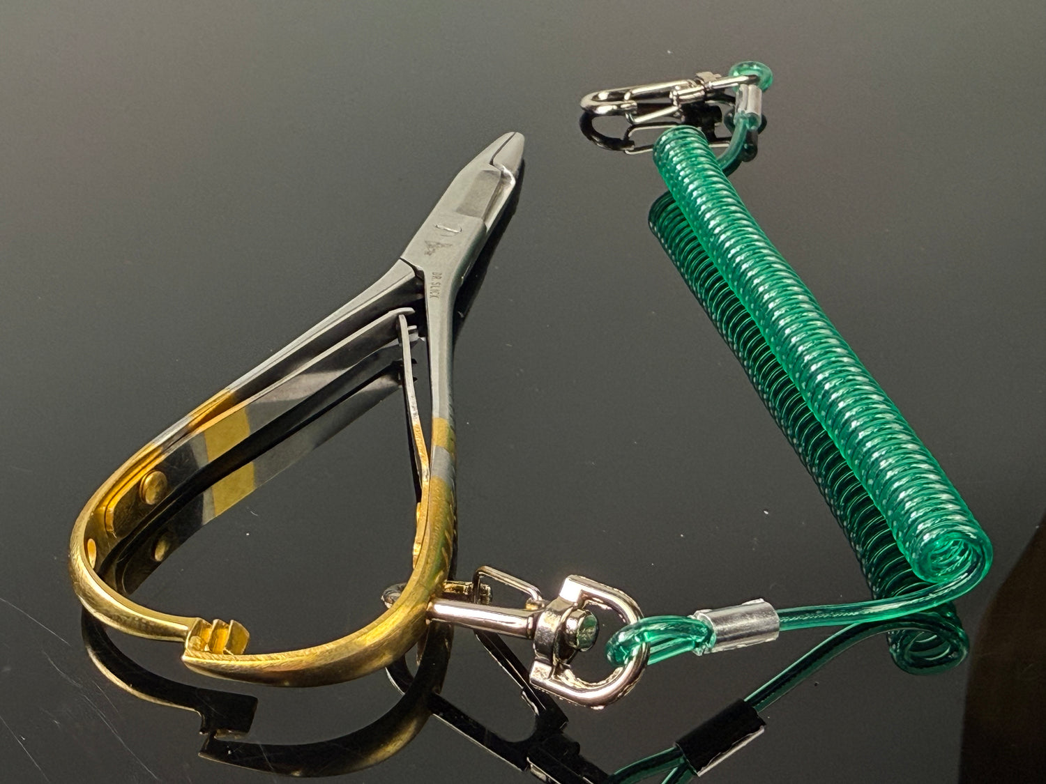 Same basic concept as the mitten clamps, but with a serrated scissor mounted behind the jaws. This addition allows for cutting tippet/leader material, trimming flies stream-side or opening that pesky bag of jerky. Comes spring-loaded, and with wrist lanyard attached.