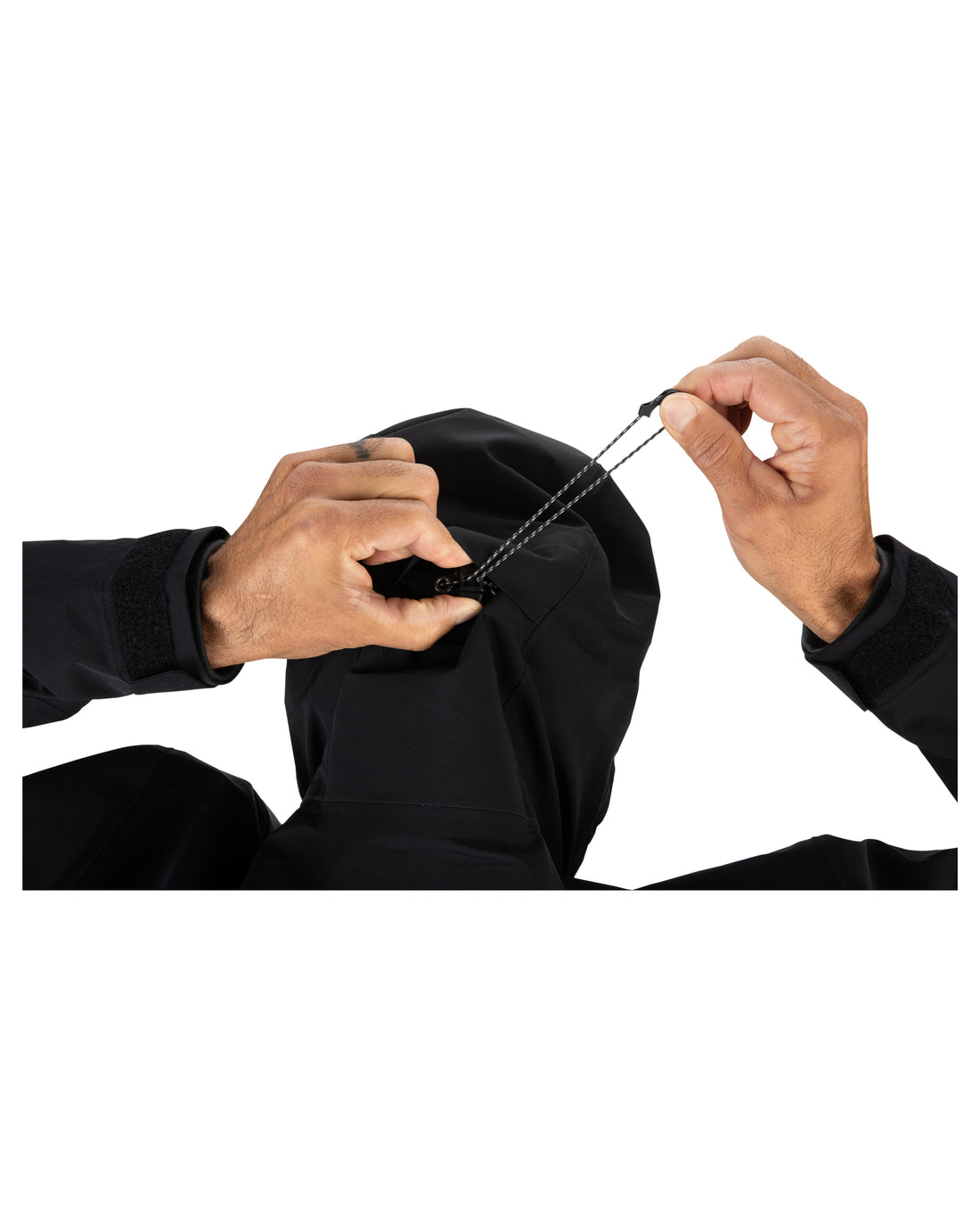 - Single point adjustable storm hood with high collar and bonded brim to shed rain