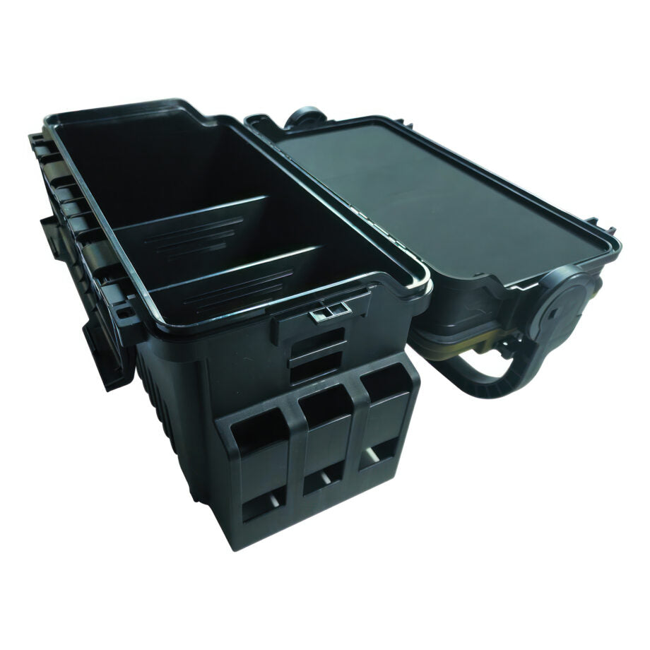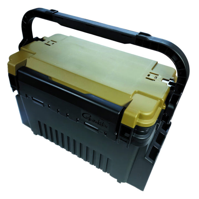 Gamakatsu®, the world’s leading manufacturer and innovator of fishing hooks and terminal tackle introduces the newest addition to the G-Box series, the G-Case 3000. The G-Case 3000 solves all your tackle solutions in a premium way. Equally effective in freshwater or saltwater, the G-Case 3000 is manufactured in Japan from strong and durable plastic for years of reliable use. The box starts with a large and comfortable handle that has a locking feature when in the upright position to keep the contents secure. The handle allows for easy transport in the boat or on the shore. The hinged lid flips back to create a surface work area table that can be used for lure rigging. Storage abounds in this unique box with two different customizable storage compartments. Opening the olive-colored lid reveals a quick grab section that has six removeable dividers that an angler can customize to their own preferences. The main inside storage area has two customizable, removeable dividers that allow a user to easily create custom configurations to meet their personal needs.