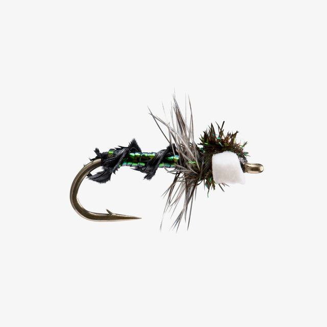 This pattern utilizes several design features in a very tiny offering. The abdomen is flash spiraled with a quill for segmentation. Then hackling, peacock and white foam tufts for the head and thorax. If you midge fish, you will want this fly in your collection.