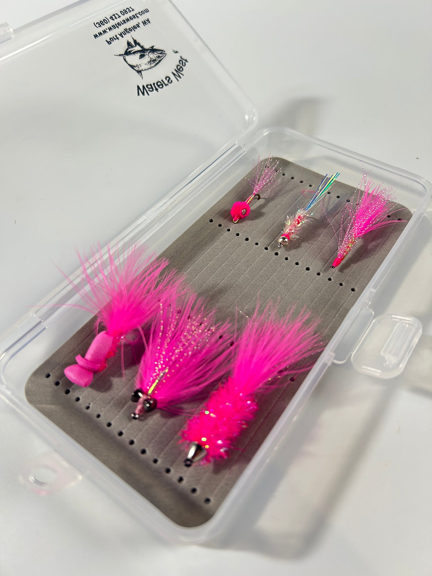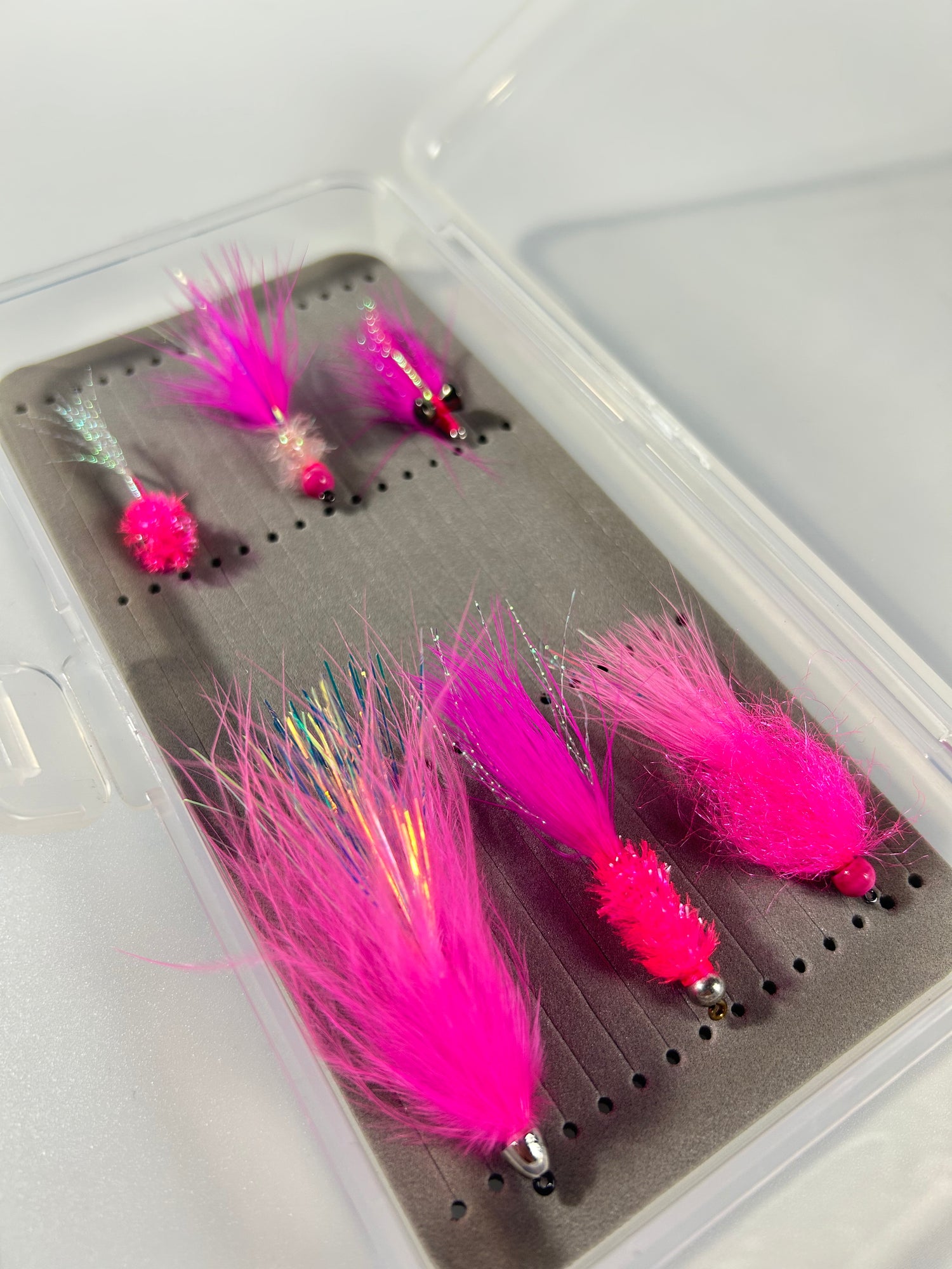 Choose from six or twelve pink and flashy flies all ready for you to catch Pink Salmon. All flies are custom tied here in shop🇺🇸, come in a nice Waters West logo fly box.