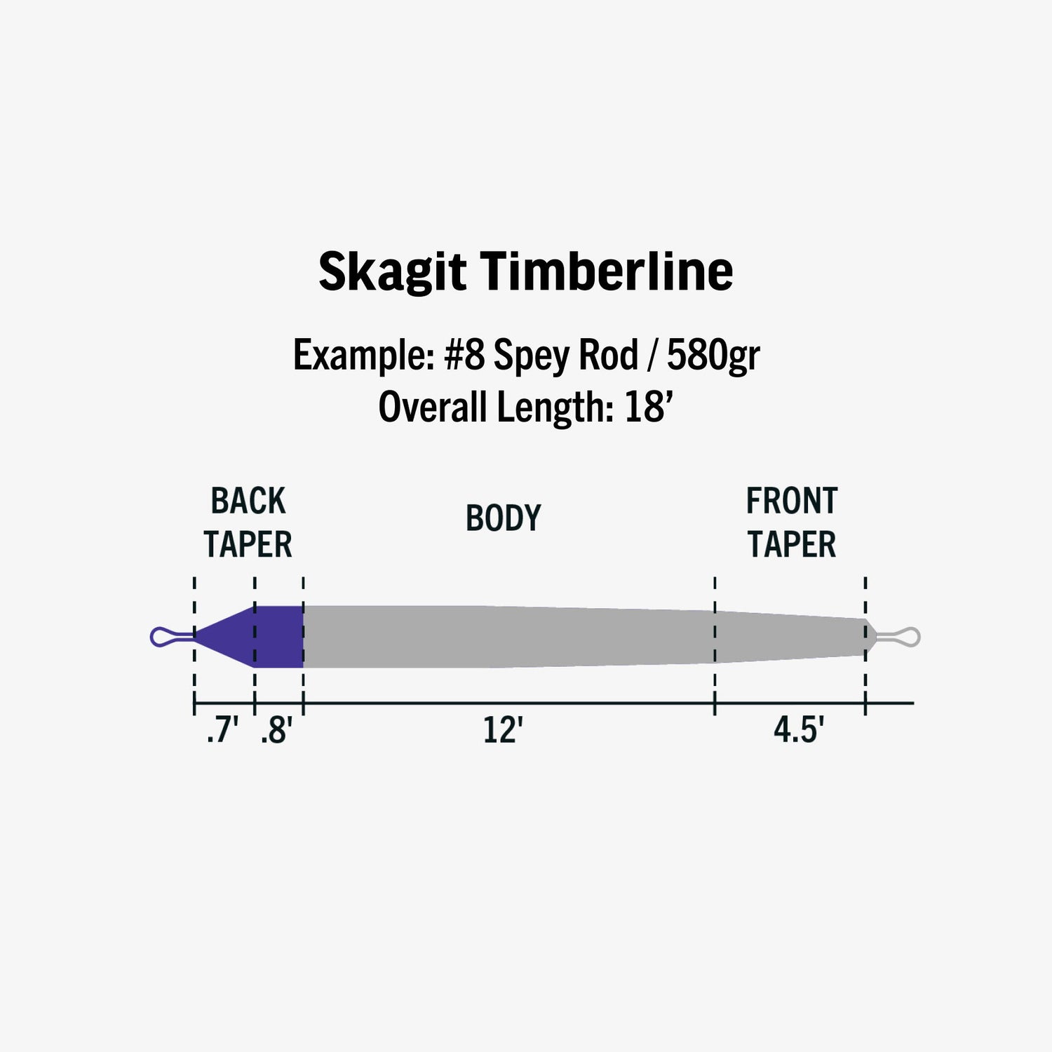 The Skagit Timberline is an 18-foot shooting head that brings effortless performance to your coastal steelhead program. The compact design makes shorter two-handed rods sing when casting space is limited. Because of its heavily rear-loaded and progressively tapering design, it easily handles the heaviest T-tips, while still delivering a full range of marabous and modern steelhead flies with controlled loop precision.