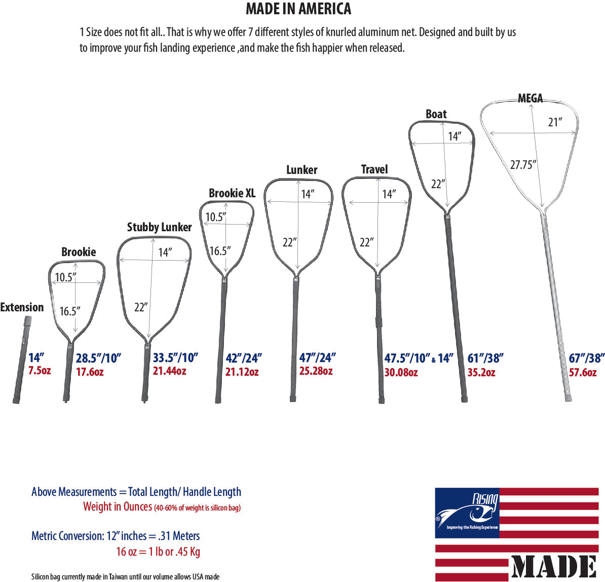 The Brookie Net is the ideal landing net for chasing trout on small streams, panfish at the local pond, or bushwhacking into your favorite high mountain lake. Our shortest handle with a smaller hoop size than the Lunker, but the same classic RISING shape.