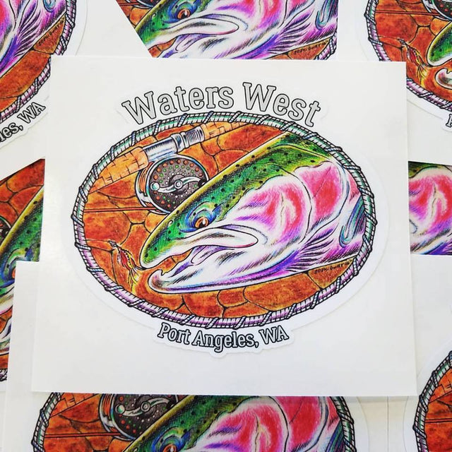 The Waters West Logo is oval shaped and modestly sized, printed on the highest quality vinyl stickers which makes them suitable for any vehicle bumper or back windshield or just about anywhere you wish to stick em'. To all who visit our OP rivers, locals, friends, friends of friends, all those who shop on our online store, thanks and happy fishing!