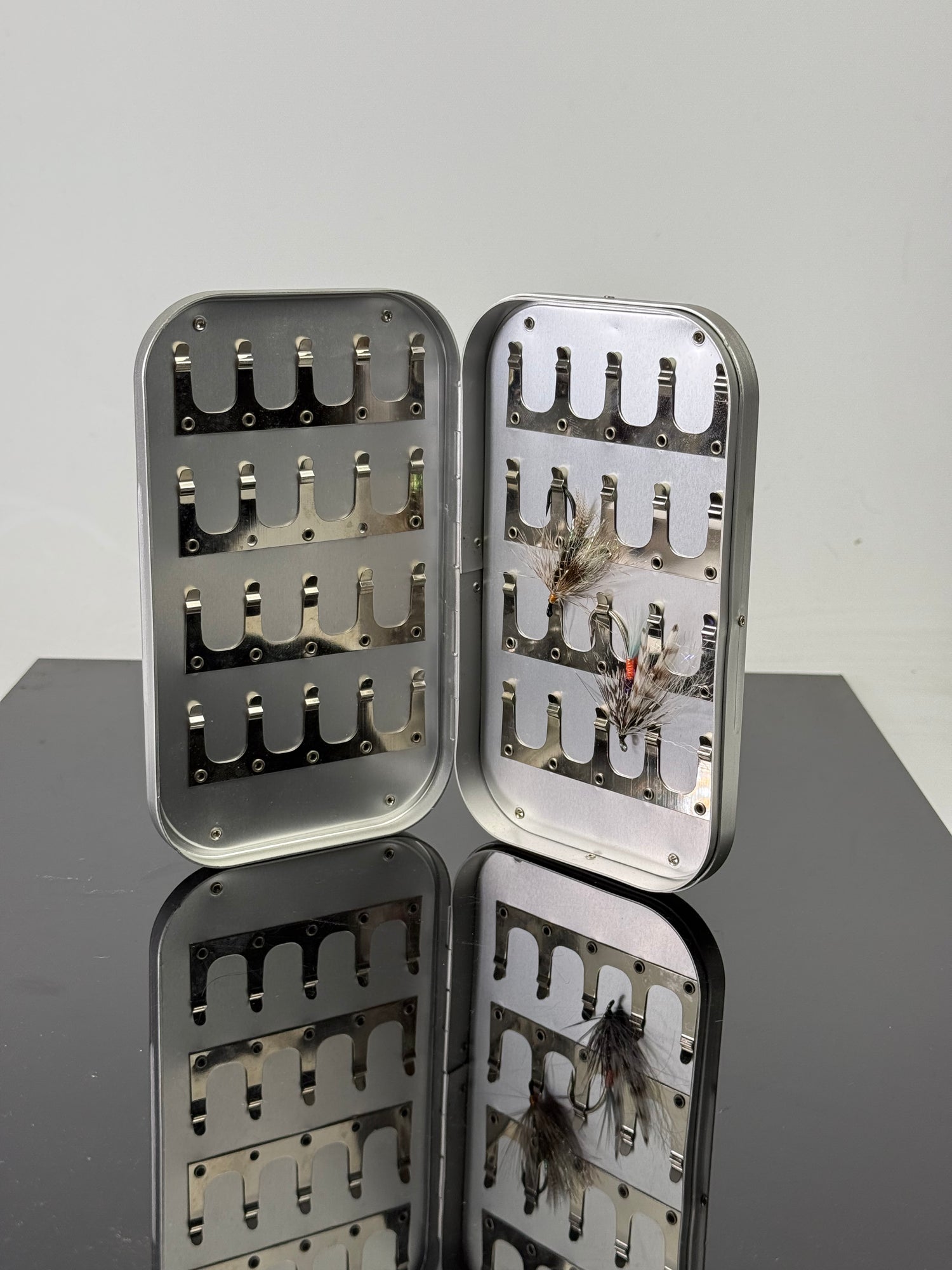 A revival of an iconic Slimline aluminium fly box. The Slimline box is 5/8th inches thick to easily slip inside a fishing waistcoat pocket.